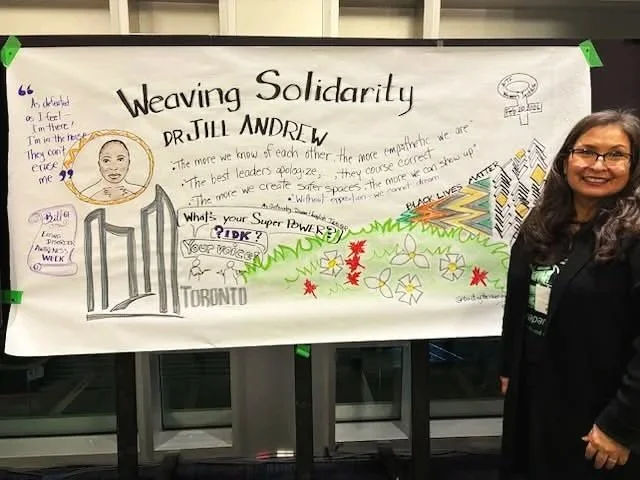 A parallel visual capture of Dr. Jill Andrew’s keynote address, rendered in real time alongside fellow Graphic Recorder, Julia MacRae. (photo credits: J. MacRae).